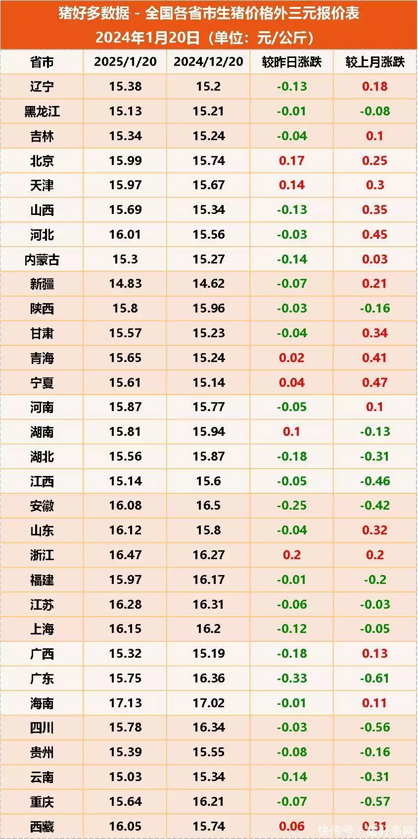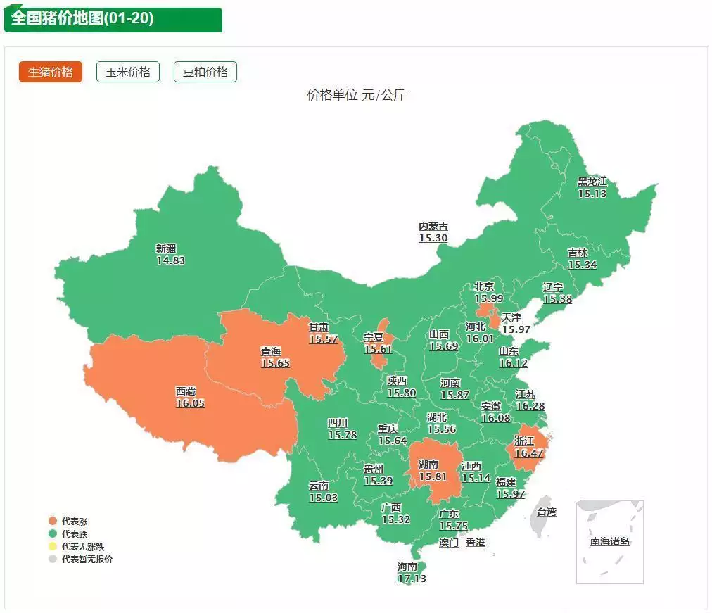 华东地区“跌声四起”,例如安徽单日猛跌0.25元/公斤,上海下跌0.12元/公斤,山东、福、江苏同样“跌跌不休”,每个区域生猪均价在15.97-16.47元/公斤之间;华南地区直接“跌翻天”,广东、广西一夜分别下跌0.33、0.18元/公斤,猪价下跌刹不住车,每个区域生猪均价在15.32-15.75元/公斤之间;